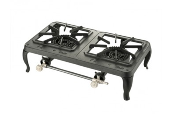 Gietijzeren 'Foker' gasbekken Dubbele pit Afmetingen BxDxH: 51x27x9 cm Inclusief aansluiting (ontspanner met slang) Gasfles: propaan 10,5 kg met buitendraad (TS-aansluiting)zie 'Verkoop'
