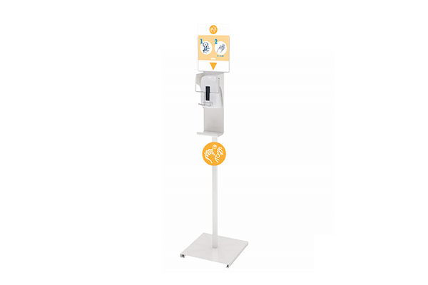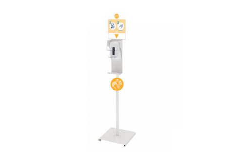Vrijstaande hand hygiƫne zuil met navulbare dispenser en presentatiescherm.